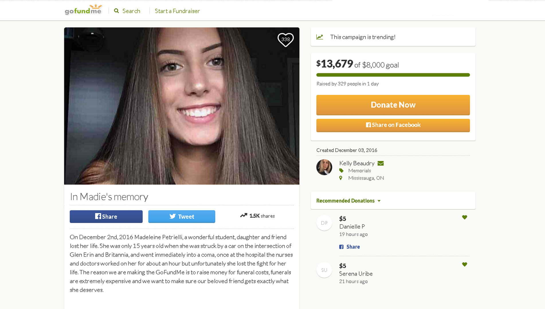 Peel police have identified the 15 year-old girl who died Friday night in Mississauga, after being hit by a car, as Madeleine Petrielli.
