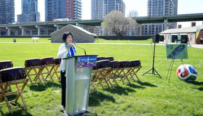 Mayor Olivia Chow, Ontario sports minister Neil Lumsden, Toronto’s Executive Director for the FIFA World Cup Sharon Bollenbach and others were on hand for Monday’s announcement at the Fort York National Historic Site.