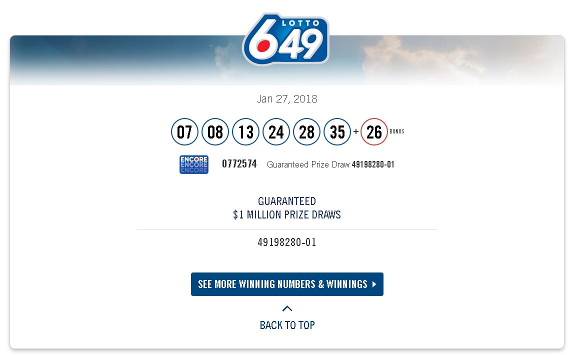 The LOTTO 6/49 ticket was for the Saturday, Jan. 27, 2018 draw worth $23,324,912.20.