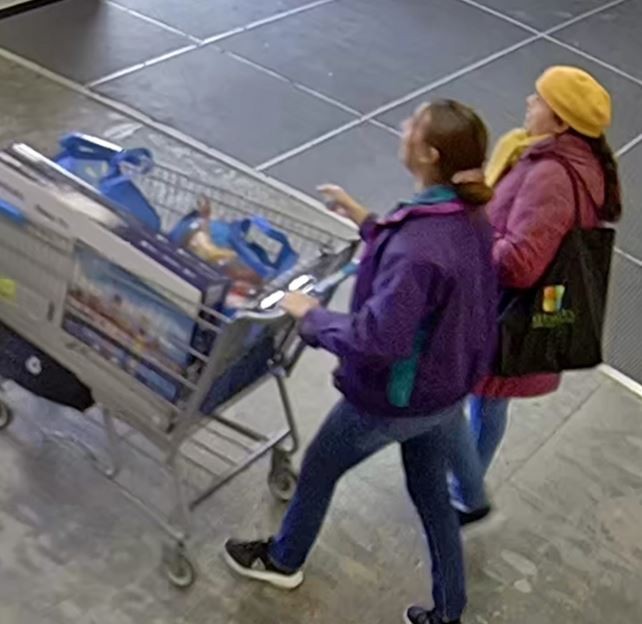 Images show the two women leaving the store with a cart full of items, including a flatscreen television before leaving the area in a white Toyota Camry.