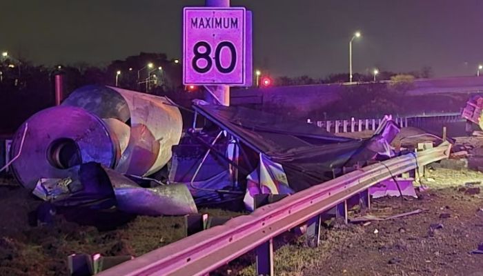 The collision caused extensive damage to approximately 300 feet of guardrail separating the northbound and southbound lanes. Debris from the transport truck and rail was scattered throughout the northbound roadway.