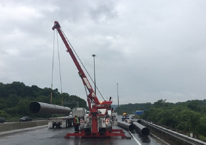 Around 11:30 a.m. a transport truck lost its steel pipe load on the highway. OPP say the truck was heading westbound when it drove over a bump and eight, 50-foot steel pipes broke loose onto the highway.